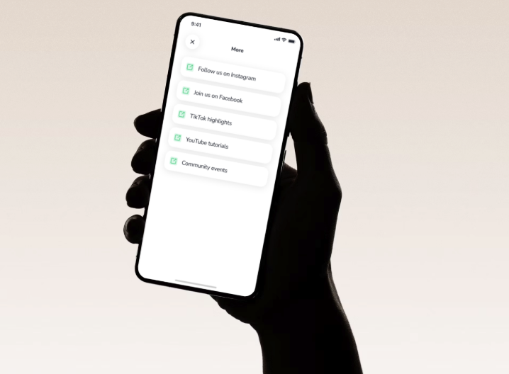 Un espacio personalizable en el menú de la aplicación donde los operadores pueden añadir hasta cinco enlaces externos: sitios web, páginas de comercio electrónico, páginas de visitas, páginas de preguntas frecuentes adicionales, redes sociales, ofertas de socios, etc.