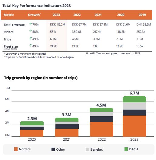 2024 foi ainda mais forte para a Donkey Republic. A empresa registrou uma receita de DKK 145 milhões, representando um aumento de 25% em relação a 2023. Pela primeira vez, eles também registraram um EBIT positivo de DKK 1 milhão. Isso mostra que sua estratégia de longo prazo de trabalhar com cidades e otimizar as operações está valendo a pena.